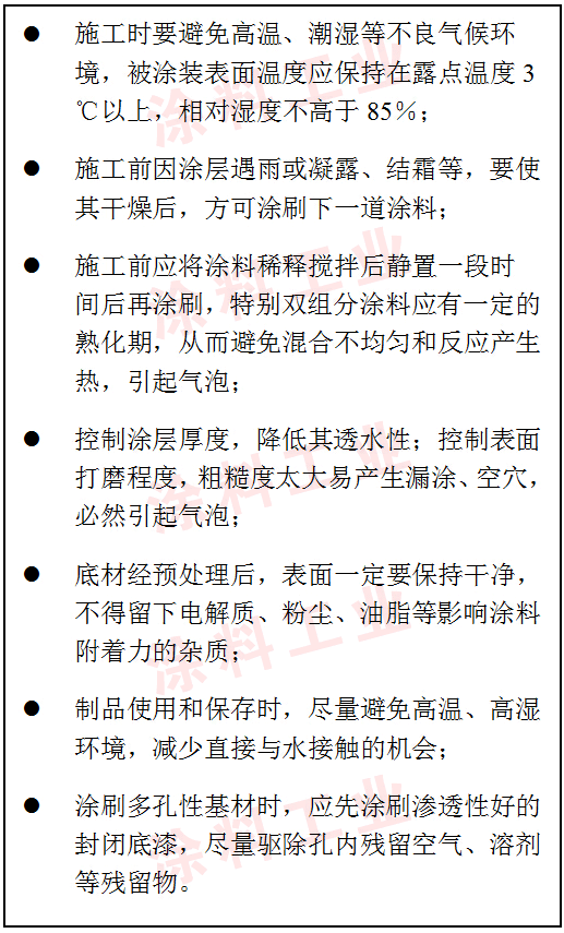 涂料生产时,严格控制所用颜料、填料及溶剂的含水量;在底漆配方中,尽量避免使用可溶性的颜填料;使用溶剂要兼顾其挥发平衡,避免溶剂过多残留;在高湿环境中,使用渗透性低的基料