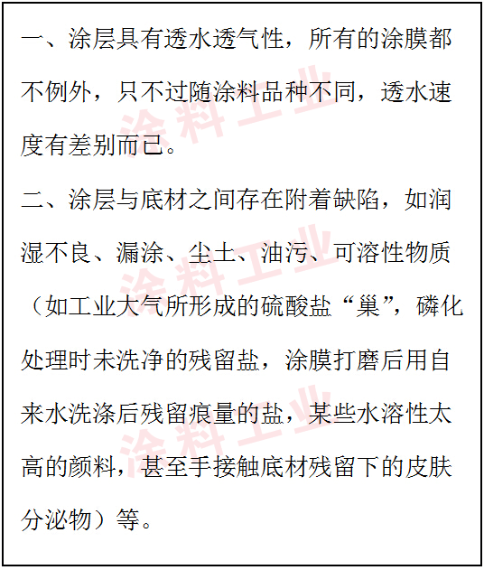 已腐蚀的表面,基材空隙中残留盐和氧化物,腐蚀性气体(如硫化氢、氯化氢、二氧化碳等)穿过涂层而被吸收,将涂层推离表面也会引起起泡或腐蚀性气体渗透进涂膜与表面发生反应,同样也会引起渗透压起泡。