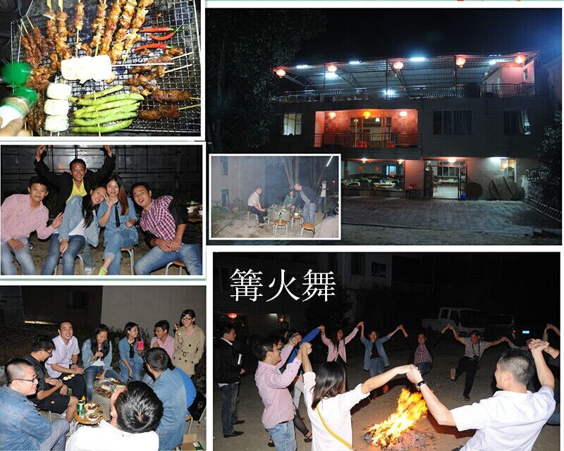 我们住在南昆山顶上的美林山庄,晚餐也安排在那,晚上的特色饭菜也是10人一桌8菜一汤,另外我们还为大家准备了真空包装的鸡、鸭、鱼、花生米等佳肴,酒水、饮料俱有,让大家舒舒服服的享受了一下,缓解了一点路途的辛苦。晚饭后来到了农家大院,公司人员自发组织的烧烤及篝火晚会。篝火点燃了,随着音乐,跟着节奏,围着篝火,公司总经理和大家一起手牵手,围着篝火边唱边跳,笑声、歌声、号子声、掌声阵阵。