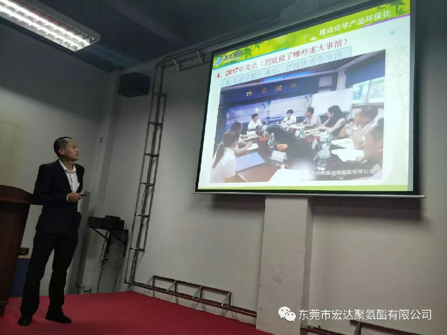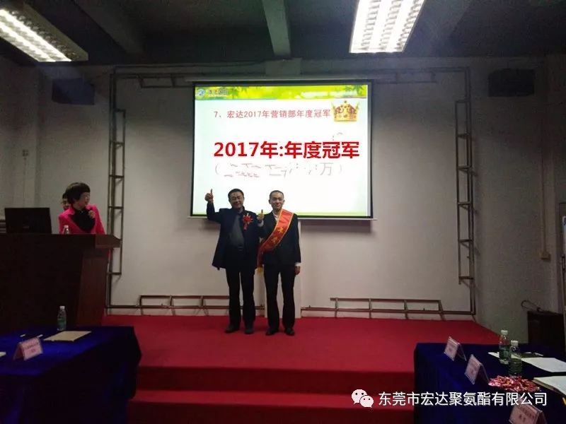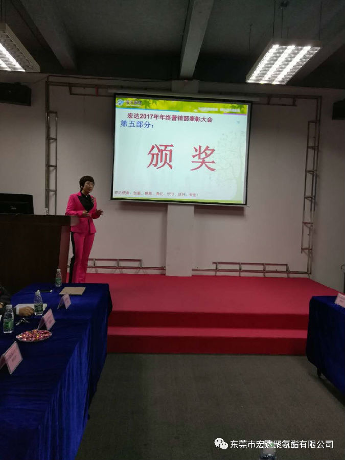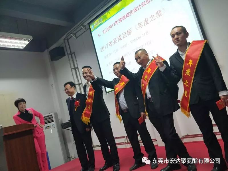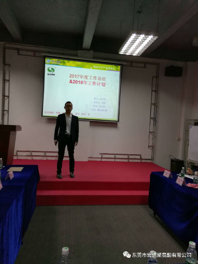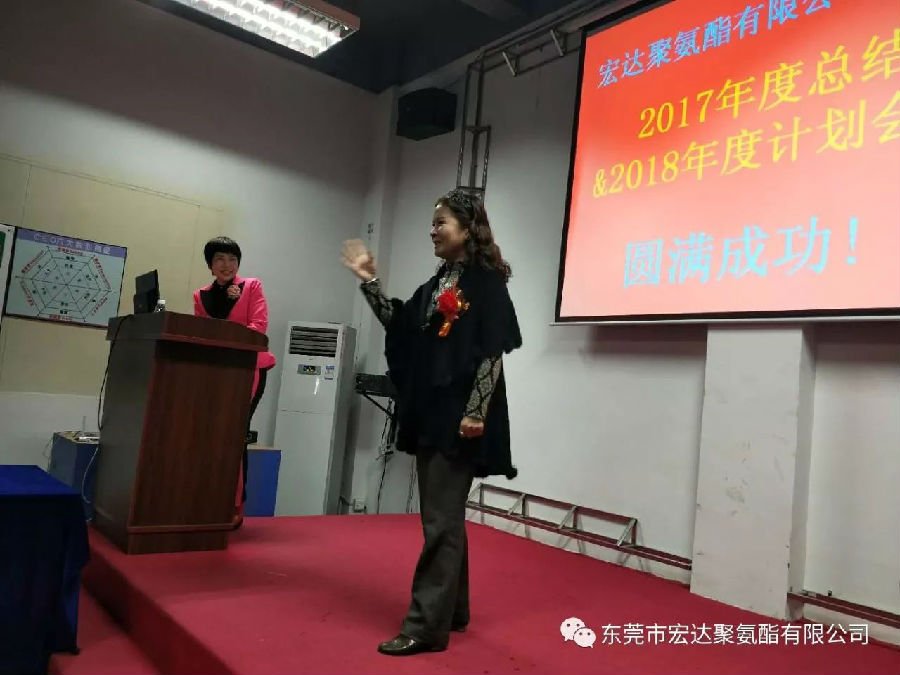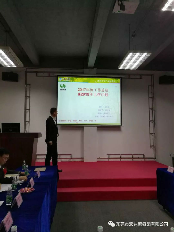 最后,宏达的大家长,王瑞宏总经理就此次的会议做出了总结,王总表示,2017年对于化工行业来说相对艰难的一年,但感恩所有客户的支持和帮助,让宏达得以持续发展。也感恩宏达全体人员对工作的努力和付出,2018年我们宏达人会坚守使命“推动化学产品环保化”,努力实现愿景“做世界一流的聚氨酯供应商”!