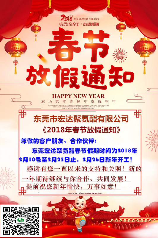 东莞宏达聚氨酯有限公司春节假期定于2018年2月10号开始至2018年2月25号止,2018年2月26号(正月初十一)新年开工。