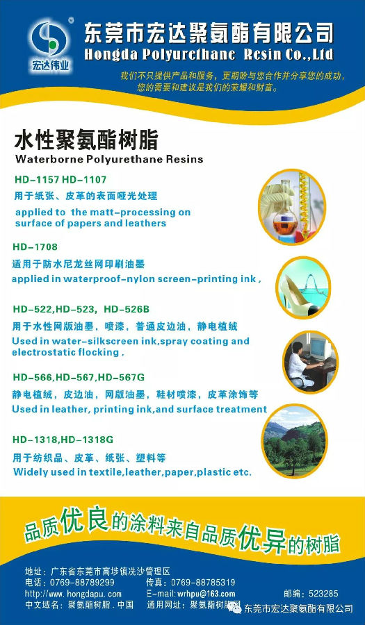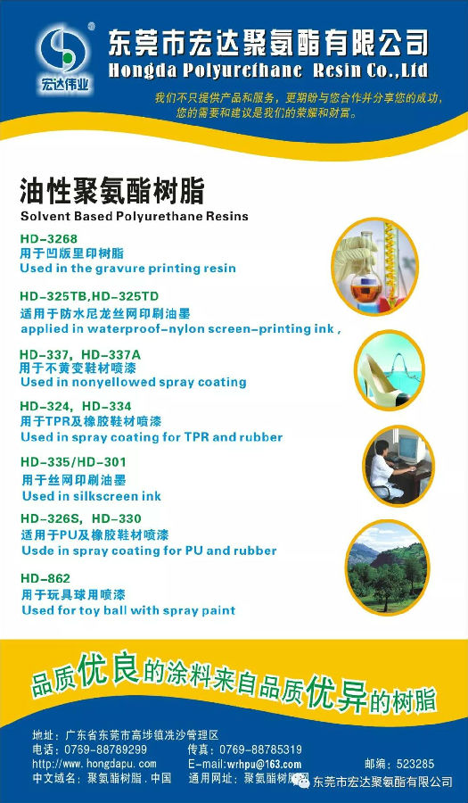 东莞市宏达聚氨酯有限公司专业生产油墨涂料、皮革化工、静电植绒用聚氨酯树脂。分为水性聚氨酯树脂、油性聚氨酯树脂两大类,油性聚氨酯树脂广泛应用于TPR及橡胶喷漆、丝网印刷油墨、PU及橡胶材喷漆、不黄变鞋材漆、耐蒸煮复合油墨等等。水性聚氨酯树脂广泛应用于水性丝网及皮革喷漆、皮革表面处理剂、静电植绒皮革涂饰、纺织品、皮革、纸张、塑料等等